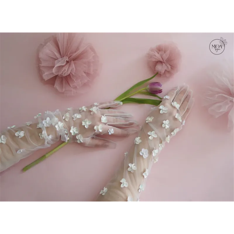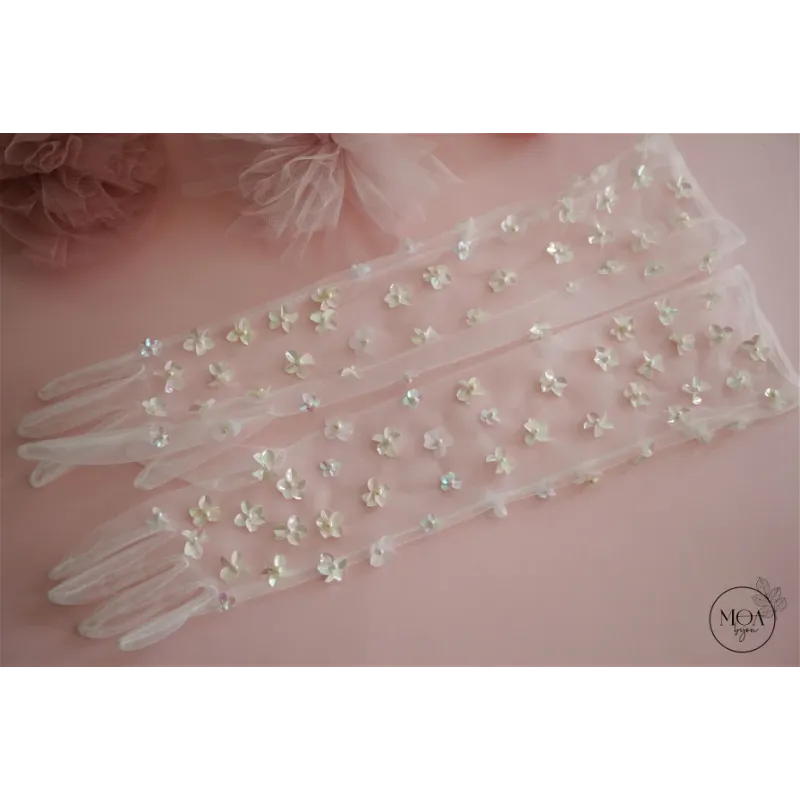 Manusi din tulle brodate cu flori 3D din paiete de diferite dimensiuni si perle. Fiecare floricica este cusuta manual in atelierul M.O.A. Bijou din Oradea si are in mijloc cate o perle de sticla ivory. Paietele sunt de 3 feluri: alb mat, alb cu reflezii AB si alb cu reflexii roz. Materialul este ivory.