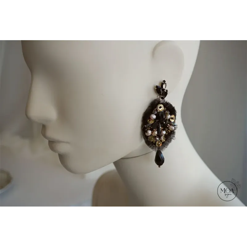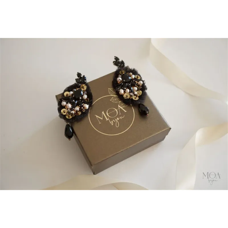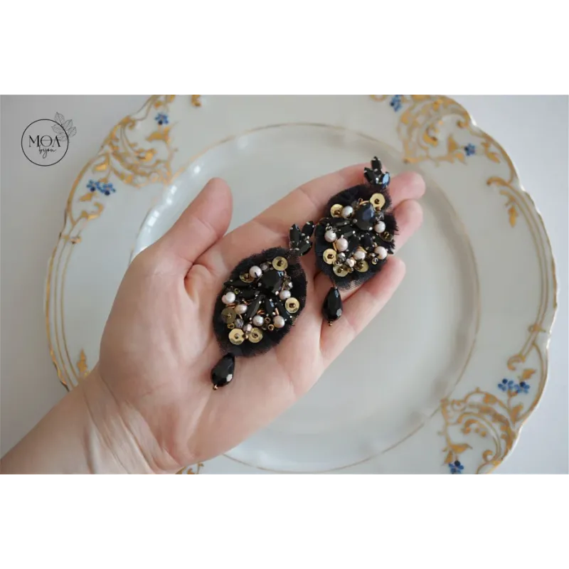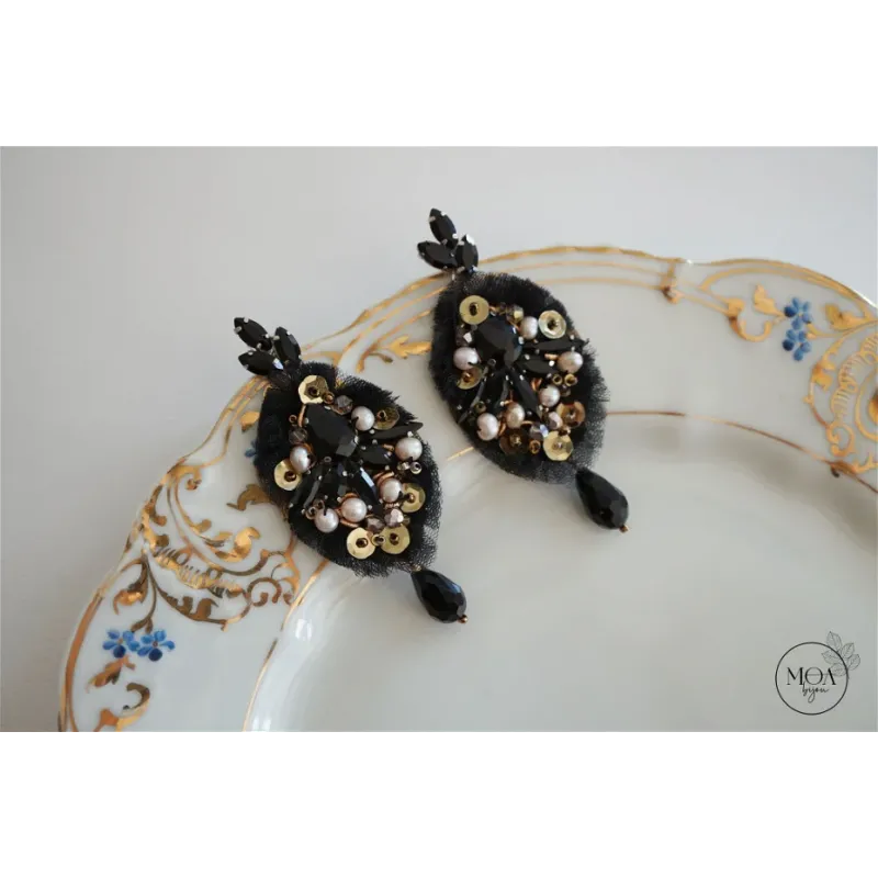 Cercei statement cu cristale, margele si tulle negru cusuti maunal in atelierul M.O.A. Bijou din Oradea. In partea din mijloc predomina cristalele din sticla neagra opaca care sunt inconjurate de perle de cultura roz, paiete, margele Toho, fir auriu, tulle si margele cehesti. Din fiecare cercel atarna cate un cristal lacrima iar tortitele sunt din otel inoxidabil si au cristale frunzulite.